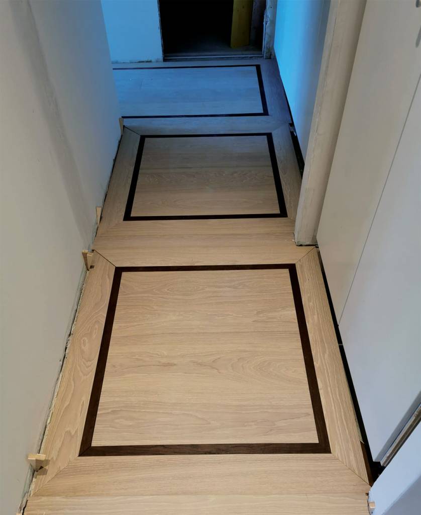 Cada tabla fue cuidadosamente cortada y alineada para mantener la precisión geométrica y la simetría en todo el pasillo. Los marcos oscuros añaden profundidad y sofisticación, transformando una superficie funcional en una verdadera declaración de diseño. Este enfoque no solo aumenta el atractivo visual, sino que también refleja la dedicación a un acabado de alta calidad.