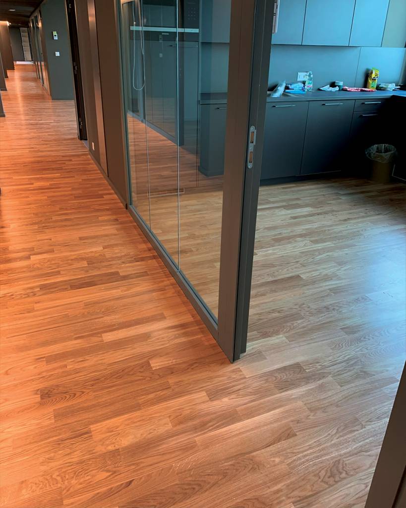 Este projeto representa uma renovação em grande escala concebida para trazer sofisticação e funcionalidade a um espaço de escritório moderno. O ponto central da transformação é o piso de madeira lindamente restaurado, que agora irradia calor e elegância ao longo do corredor. O seu acabamento polido realça a textura natural e a durabilidade, criando um ambiente elegante e profissional.